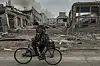 UKRAINA: En mann sykler forbi et postkontor ødelagt av russerne i Kurakhove i Donetsk. Bildet er tatt 7. november 2024.Foto: Anton Sjtuka, AP, NTB