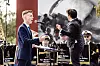 SMYKKE: Forsvarssjef Eirik Kristoffersen og billedkunstner Vebjørn Sand tar en titt på kjedet til Eystein Røset (102). I bakgrunnen står barnebarnet til krigsveteranen.Foto: Krister Sørbø, Forsvarets forum