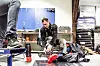 MYE UTSTYR: Joachim får på seg de nye støvlene sine. Dekkene i bakgrunnen skal med i følgebilen.Foto: Krister Sørbø, Forsvarets forum