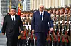 Bilder viser hvordan de to omfavnet hverandre under en storslått velkomstseremoni, som innebar artillerisalutter og paraderende soldater foran en stor folkemengde som viftet med flagg på Kim Il Sung-plassen.