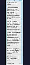 - Kalte Trump for «Daddy», «Europe is going to pay in a BIG way», «You will achieve something NO American president in decades could get done» ellers hva som helst fra meldinga (grunnet teknisk krøll finner du bildet av den nederst i fasiten)
