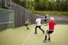 GIR ALT: De har funnet hverandre til tross for aldersforskjellen. Oscar Hagen Daniel Sandsvik Aas (10) tar ballen i mål, selv om William Nordli (15) ofret alt. Sigurd Cornelius Øie (17) til venstre i bildet.Foto: Jo Straube, Forsvarets forum