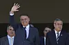 BLID: En smørblid Bolsonaro vinket til kolonnen fra toppen av trappene til presidentpalasset, flankert av blant andre forsvarsminister Walter Braga Netto.Foto: Eraldo Peres, AP, NTB