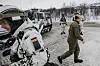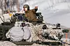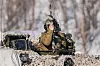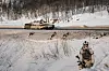 To stormpanservogner av typen CV-90 runder svingen og kjører inn på rasteplassen. Et lag på sju soldater kommer ut av bakdøra, og kommandoene kommer.