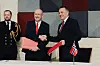 BEKREFTER OPPDRAG: Forsvarsminister Tore O. Sandvik (til høyre) og hans britiske kollega John Healey (midten) forteller begge torsdag om den norsk-britiske tokten mot russiske ubåter.Foto: Sunniva Berggreen Kaalaas