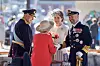 ANKOMST: Det danske kongeparet ankom med Oslo med kongeskipet Dannebrog og ble tatt imot på Honnørbrygga av kong Harald, dronning Sonja, kronprins Haakon og kronprinsesse Mette-Marit.Foto: Ørn E. Borgen / NTB
