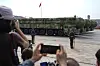 Xi inspiserte de oppstilte soldatene og våpnene fra en åpen limousin før han vendte tilbake for å slutte seg til gjestene.