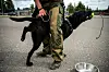 MUNNKURV: Politihunden og føreren dens sitter og venter ved skytebanen på å få starte oppgaven på den siste posten.Foto: Hedvig Idås, Forsvarets forum