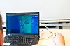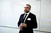 Han står i et klasserom på Sjøkrigsskolen i Bergen. Krigsspill-deltakere sitter foran hver sin PC. De har på seg store svarte briller, som holdes på plass av en hjelm.