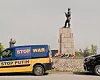 blått. «Stop Putin» og «Stop War» står det på bilen. Ved sokkelen
