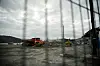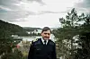 Han kikker ut mot Byfjorden utenfor Bergen sentrum. Fjordline frakter passasjerer til Danmark mens fiskeskøyter kommer inn med dagens fangst.
