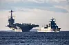 NORSK SELSKAP: Det amerikanske hangarskipet ledsages av en rekke norske fartøyer. Deriblant KNM Thor Heyerdahl.Foto: Joel Nziza, Forsvarets forum