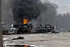 KHARAKIV: Russiske pansrede personellkjøretøy står i flammer etter kamper i ukrainas nest største by, Kharkiv.Foto: Marienko Andrew, AP, NTB