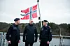 Han står på akterdekket til KNM Thor Heyerdahl sammen med forsvarsminister