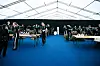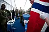 I en kakofoni av hestevrinsk og summing fra deltakere fra så godt som hele verden, lyder det noe kjent. I et gigantisk hvitt partytelt, med et blått filtteppe dekket av spor fra en tidligere opptreden i hestemanesjen, befinner musikk- og drilltroppen til Hans Majestet Kongens Garde seg.