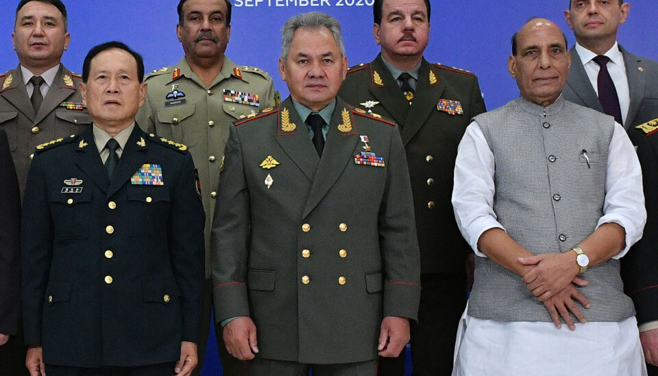 FORSVARSMINISTERMØTE: Kinas Wei Fenghe (t.v.), Russlands Sergeij Sjoijgu (midten) og Indias Rajnath Singh fotografert under møtet i Moskva. Kina og India forsøker å finne en løsning på den spente situasjonen langs deres omstridte grense i den østlige Ladakh-regionen.Foto: Ramil Sitdikov/AP
