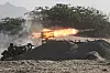 Bakkestyrker avfyrer et missil nær Hormuzstredet i Iran under militærøvelsen torsdag.