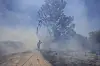 BRANN: En israelsk brannmann forsøker å slukke brannene etter palestinere sendte brannballonger mot grensa mellom Israel og Gaza.