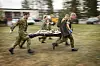 Bare noen minutter senere befinner vi oss ute i duskregn på skytebanen. Grisen henger med beina i været, spent fast i en anretning. Om lag 20 meter unna ligger en soldat med en rifle mellom hendene. Et skarpt smell flerrer luften. Det rykker til i grisekroppen når kulen treffer lårbeinet som splintres. Til slutt får grisen et skudd gjennom buken. Dette er startsignalet for førstehjelpsteamet som har stått med ryggen til. De skal ikke vite hva som venter dem når de kommer løpende bort til pasienten.
