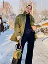 Jenny Skavlan har sydd om en gammel sovepose fra Forsvaret til en jakke og er ikledd en ullbukse fra den amerikanske marinen. Jenny Skavlan