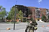 STANSET: Det massive panserangrepet ble satt en stopper for. Bildet er fra april tidligere i år, og viser en ukrainsk soldat som går forbi ødelagte bygninger i Pokrovsk.