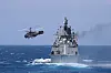 RUSSLAND: Den russiske fregeatten Admiral Grigorovich og et helikopter av typen Ka-27 tilhørende Svartehavsflåten under en øvelse utenfor kysten av Syria i 2024.Foto: Russian Defense Ministry Press Service, AP, NTB
