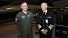 Forsvarssjef Haakon-Bruun Hanssen og Martin Tesli, sjef for det norske styrkebidraget i USA, smiler foran en håndfull journalister og fotografer.