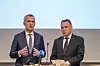 PRESENTERTE NYHETER: Finansminister Jens Stoltenberg (Ap) og Forsvarsminister Tore O. Sandvik (Ap) under en pressekonferanse på Arbeiderpartiets landsmøte 2025 på Oslo Kongressenter Folkets Hus i Oslo.