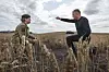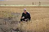 Han bøyer seg og plukker opp kornaks som han gnir mellom hendene.