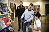 En handlekurv full av bøker blir overrakt rektor ved Grindbakken skole, Siri Elisabeth Mohr. «Gunner mate» Tyler Beckman og David Hicks har vært og handlet bøker for å fylle på med nye titler i «The English Corner» i skolens bibliotek. Her kan skolens 560 elever finne alle Harry Potter-bøkene, The Maze Runner og mange flere titler.