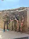 PÅ BASE: Soldatane på oppdraget i Irak har teke fleire bilete framfor sandsekkane ved tilfluktsrommet. Vi har skjerma identitetane deira.Foto: Privat