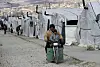 En syrisk mann og hans sønn på en motorsykkel på vei mellom telt i en flyktningleir i Bar Elias i Libanon. De er blant millioner av syrere som er blitt drevet fra sine hjem som følge av den ti år lange krigen i Syria.Foto: Hussein Malla, NTB