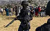 En bevæpnet politimann patruljerer mens politiminister Bheki Cele besøker Phoenix.
